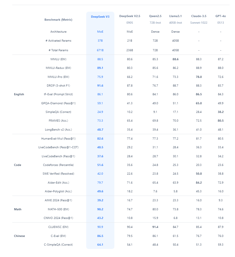 🎉 DeepSeek-R1 已发布并开源,性能对标 OpenAI o1 正式版,在网页端、APP 和 API 全面上线,点击查看详情。 DeepSeek-V3 的综合能力 DeepSeek-V3 在推理速度上相较历史模型有了大幅提升。在目前大模型主流榜单中,DeepSeek-V3 在开源模型中位列榜首,与世界上最先进的闭源模型不分伯仲。